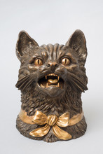 Hinged at the jaw to reveal a canister for tobacco/cigares and one for matches.